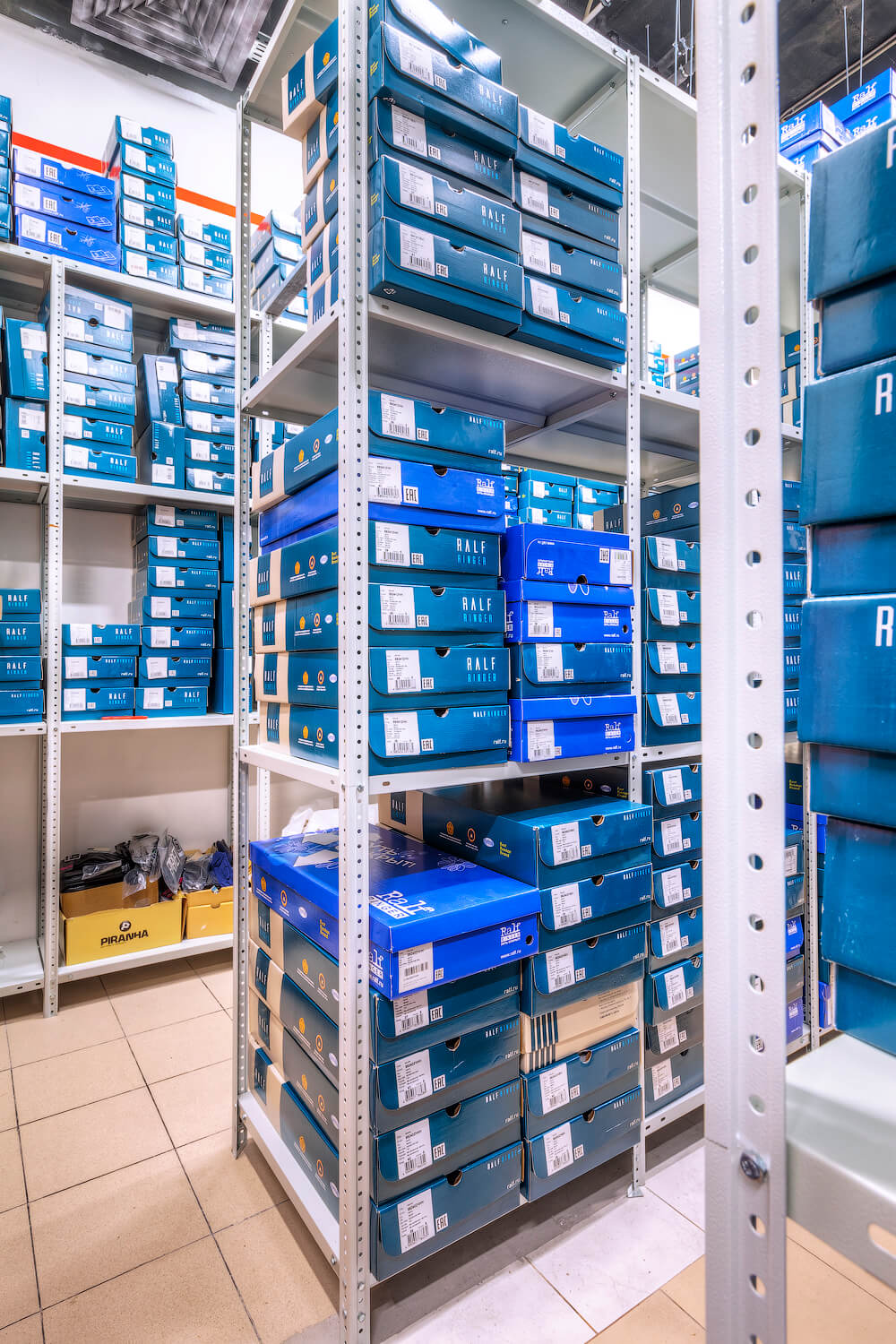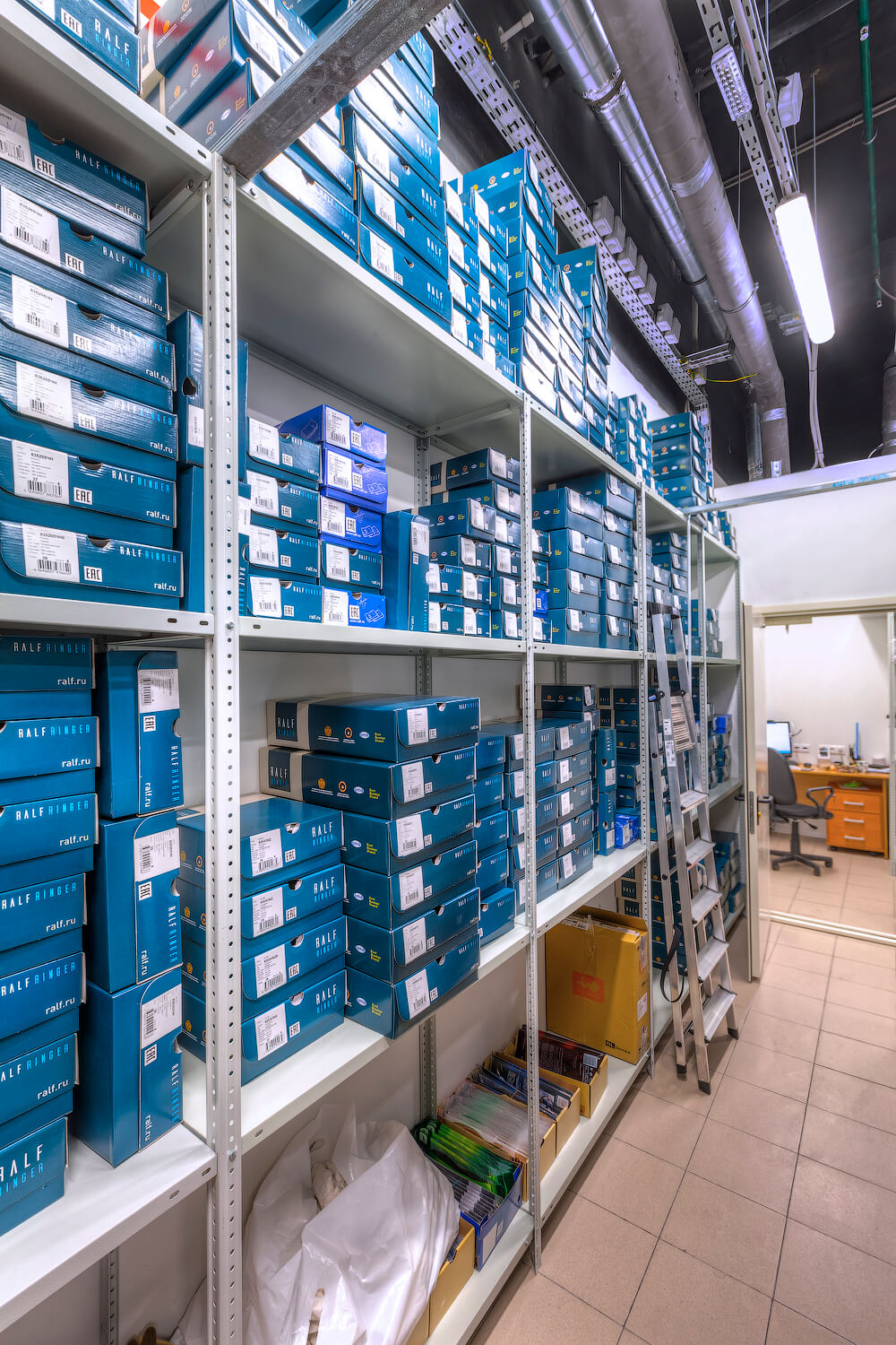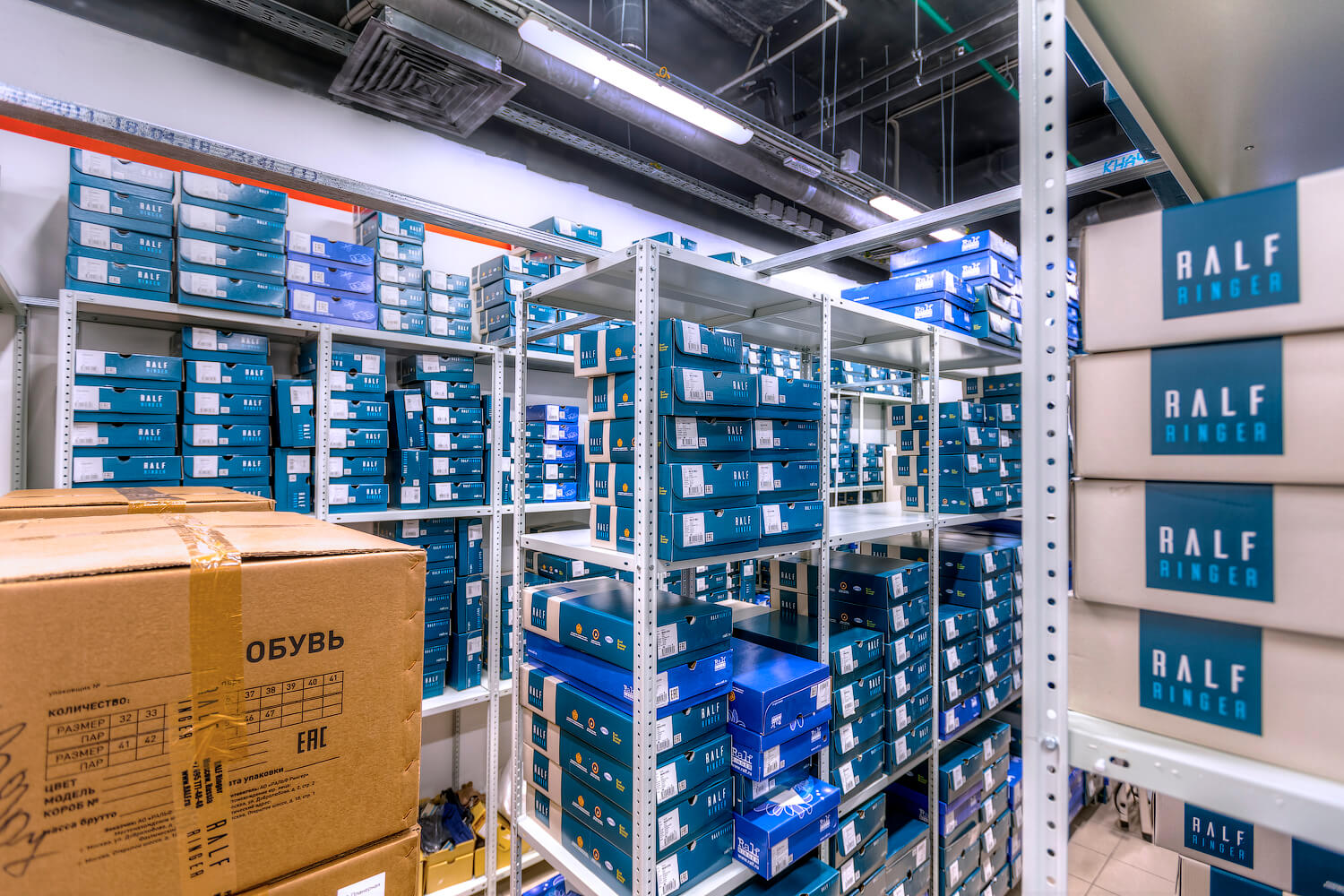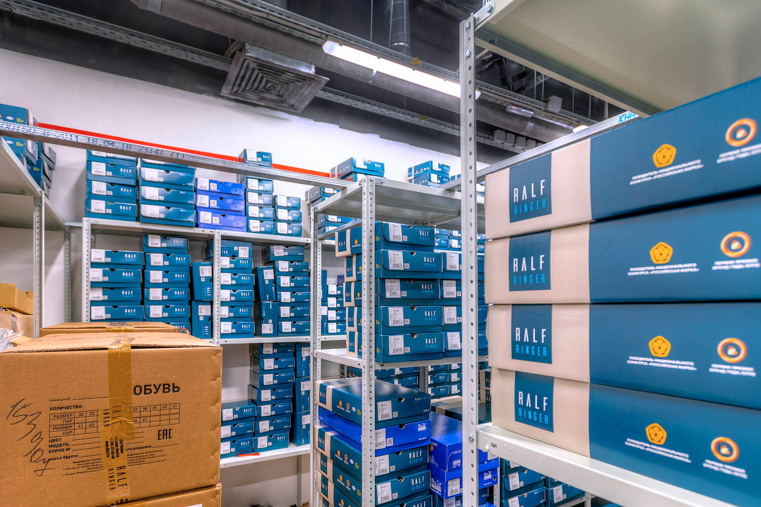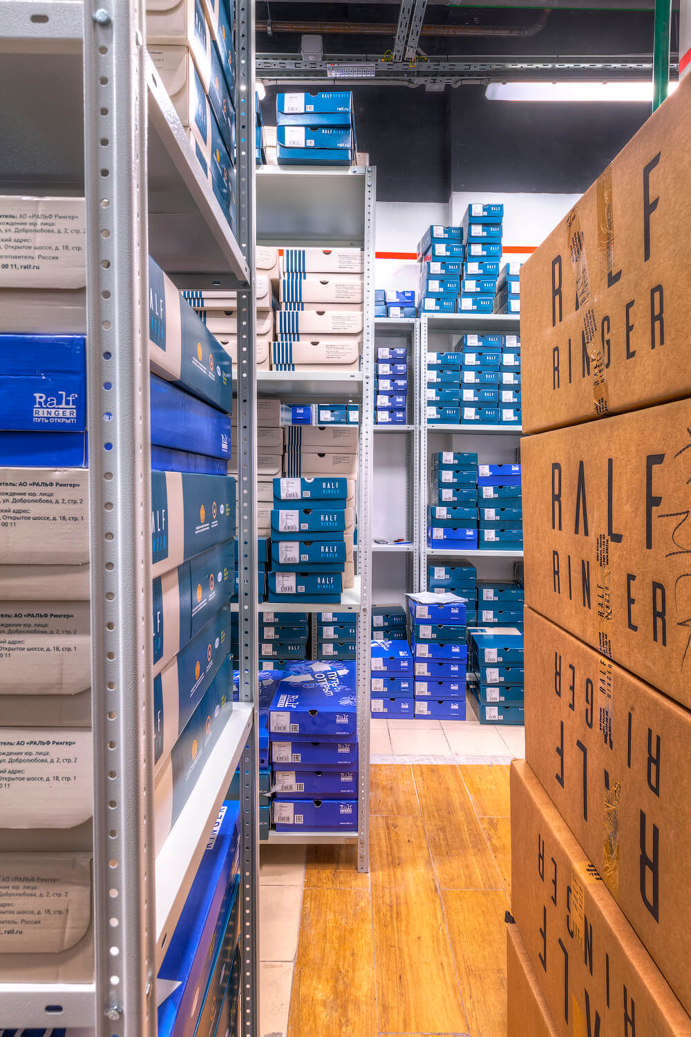 Для компании RALF RINGER являющейся крупной сетью обувных магазинов в России был оборудован склад для хранения товара в коробках. Были поставлены и смонтированы полочные стеллажи ТС «Лайт» высотой 3м, общей площадь которых составила 100 кв.м.